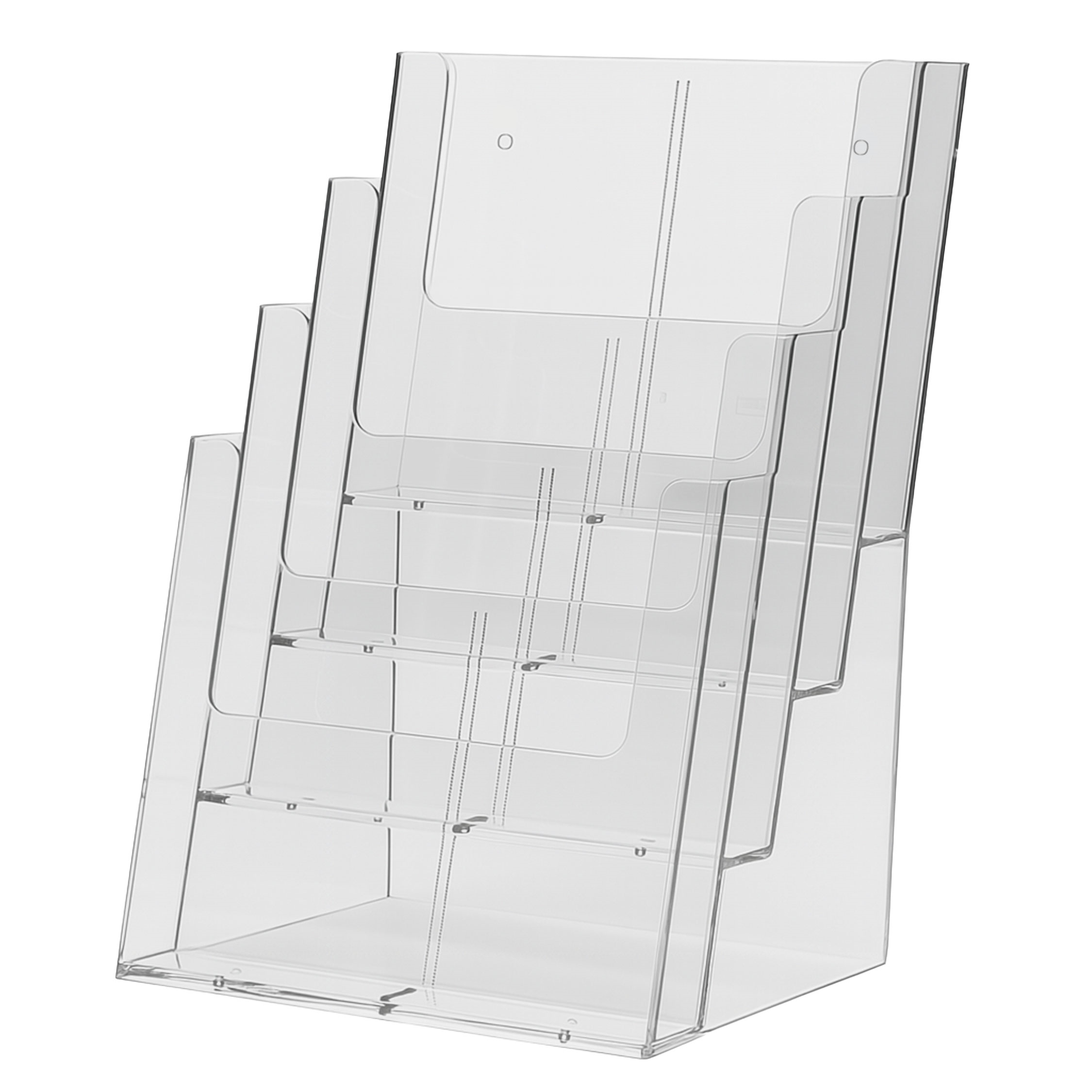 Gjennomsiktig brosjyreholder som har 4 bakker for flere brosjyrer i A4 format.