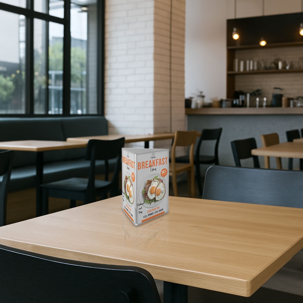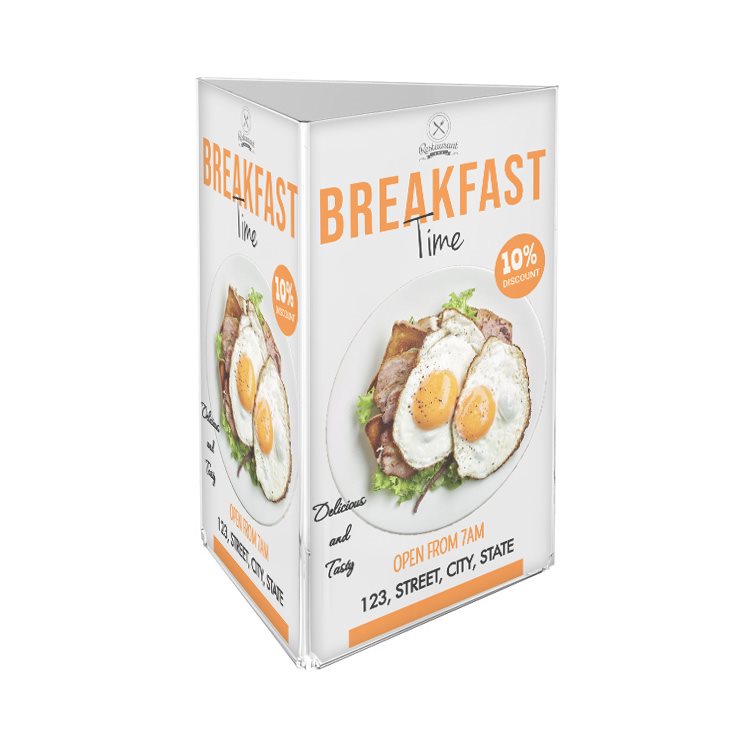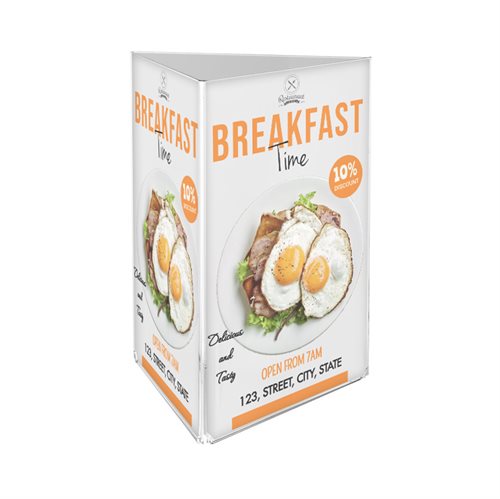 Vertikal Tresidet Menyholder fremstillt i 2mm akryl av beste kvalitet, som gir et kristallklart og profesjonelt utseende, med 3 sider til presentasjon av meny, og prislister. Velegnet til spisebord på restauranter og cafeer