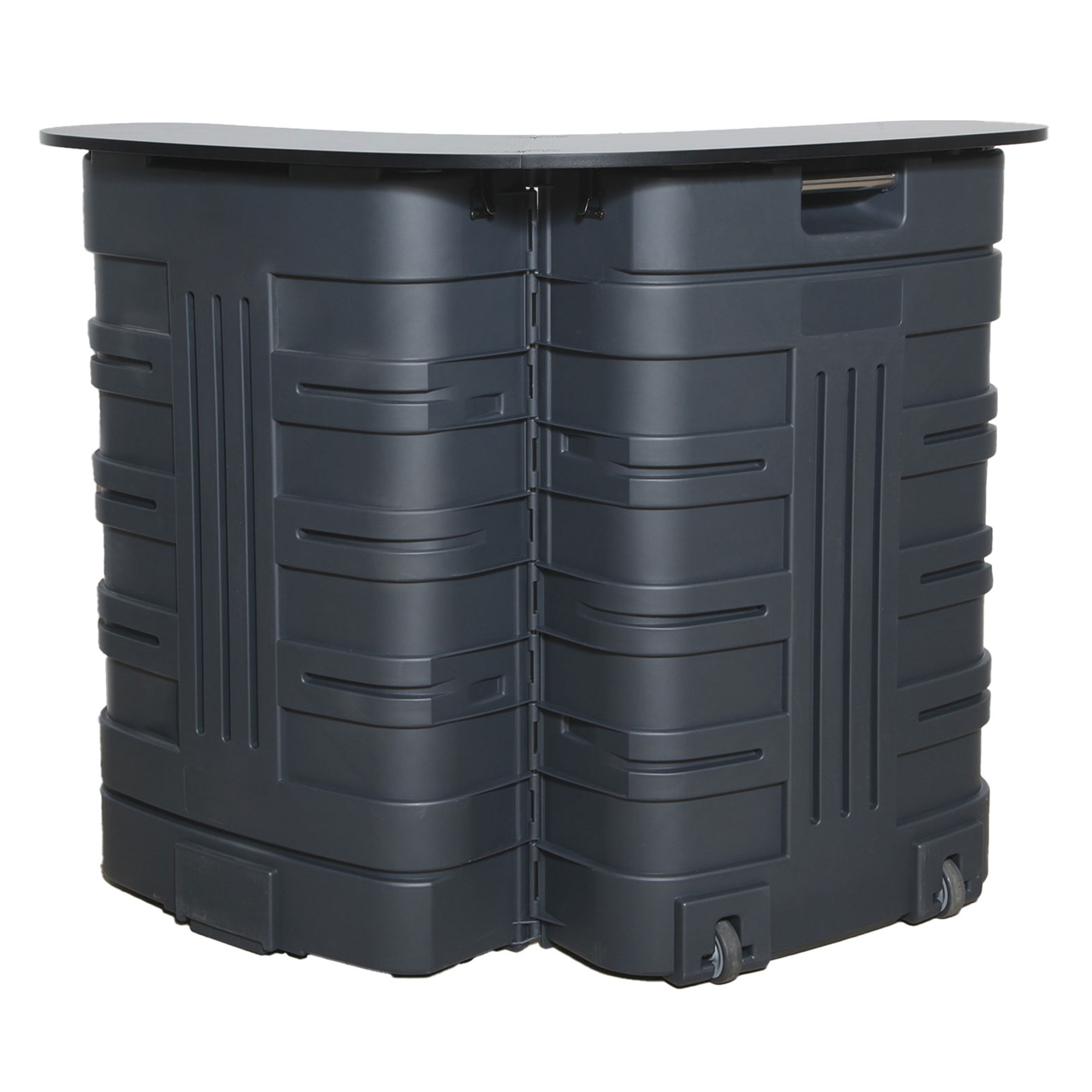 Trolley Counter er et bærbart messebord i robust lettvekts-ABS-plast, med en buet svart bordplate med god plass til utstilling av produkter og informasjon, en stor trykkflate slik at logo og budskap kan sees fra alle retninger, innebygde oppbevaringshyller og hjul for enkel transport.