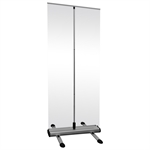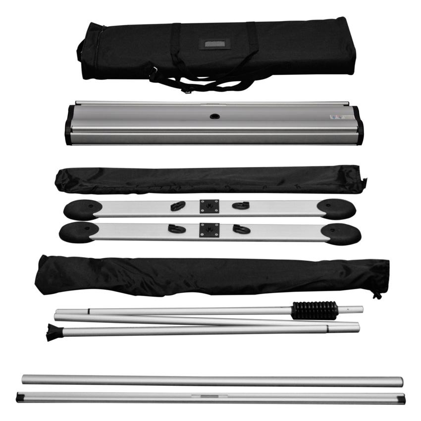 Roll up til utendørs bruk med 2 tunge føtter. Kan brukes både enkelsidig og dobbelsidig - denne versjon leveres med to banner.