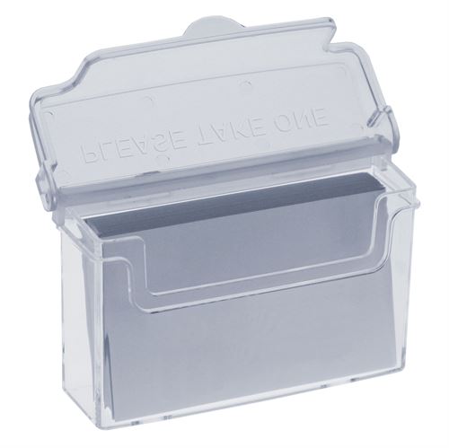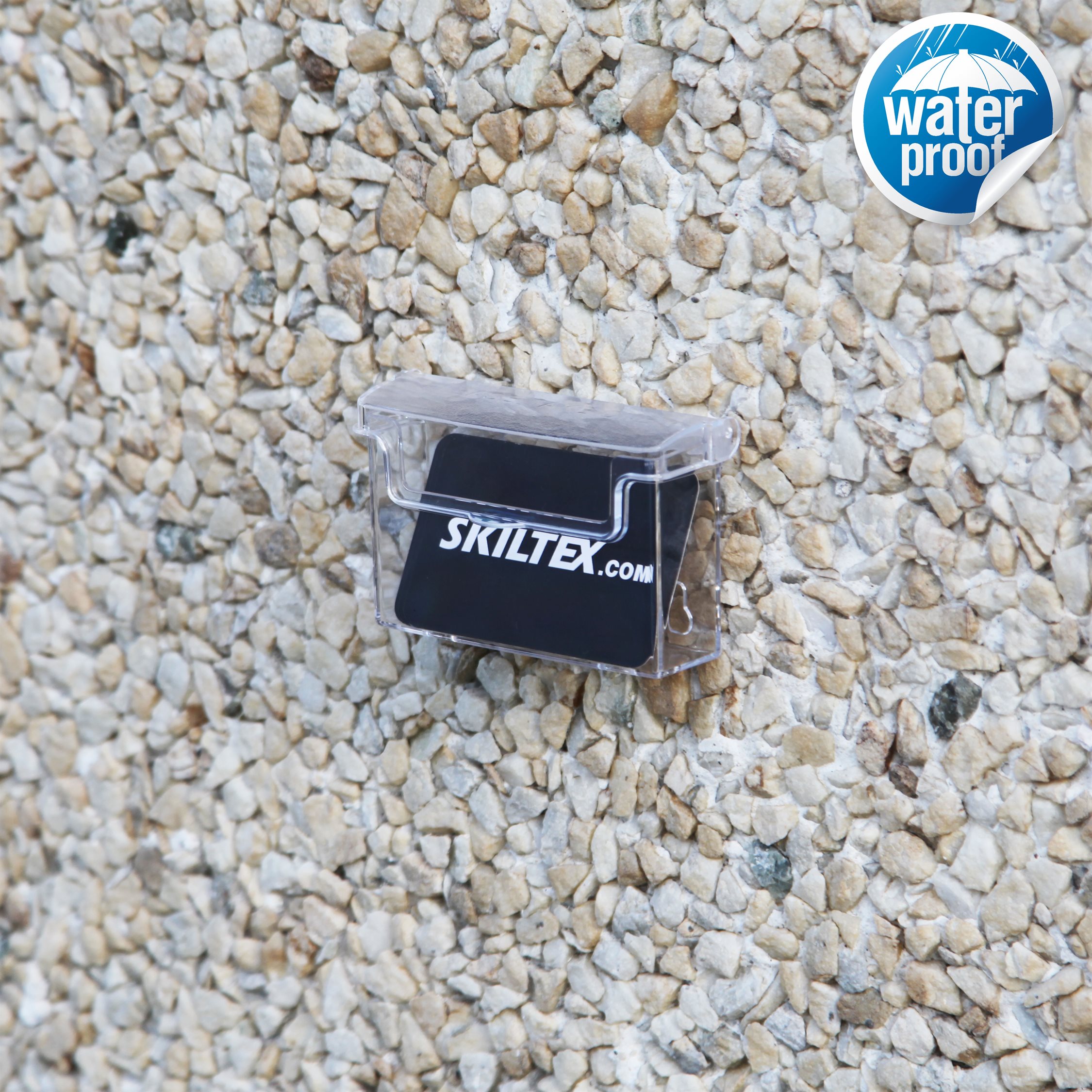Visittkortholderen er fremstilt av klar akryl. Produktet er velegnet til utendørs bruk.