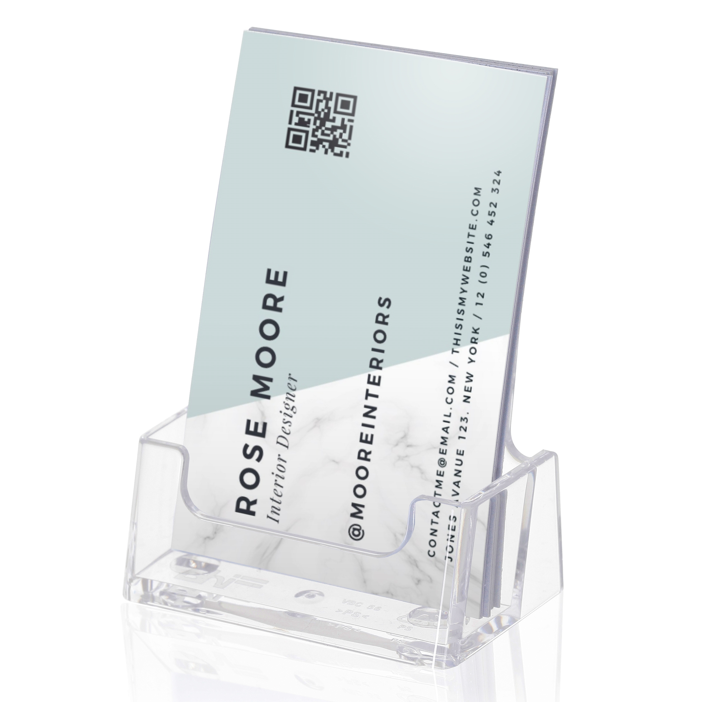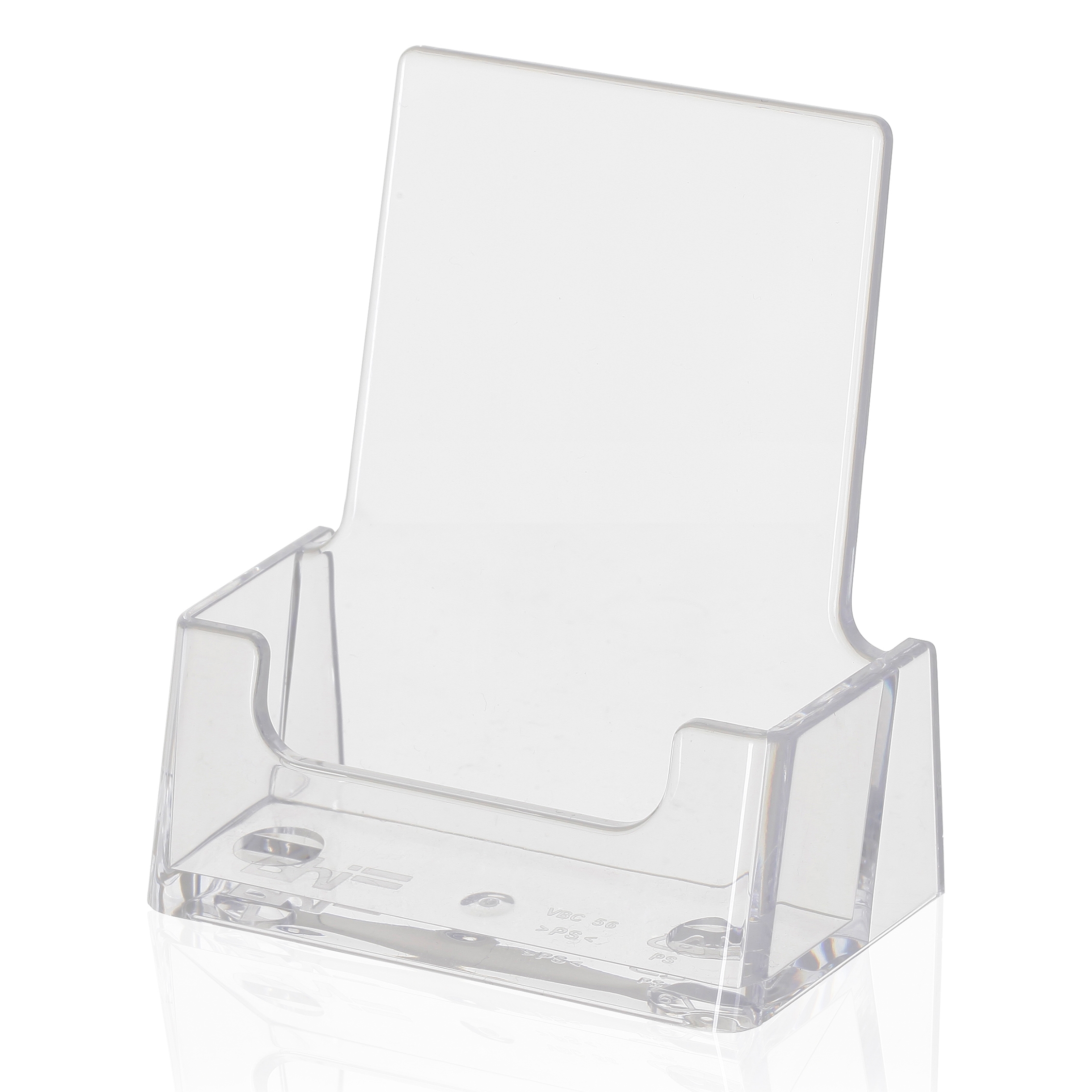 Denne visittkortholderen i høyformat kan plasseres på en disk eller skrivebord og er fremstilt av glassklar akryl av høy kvalitet.