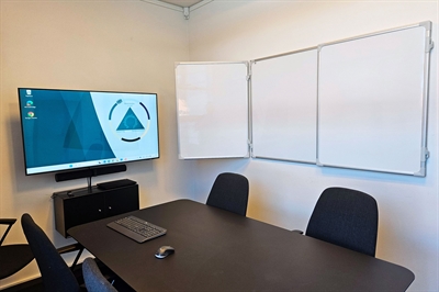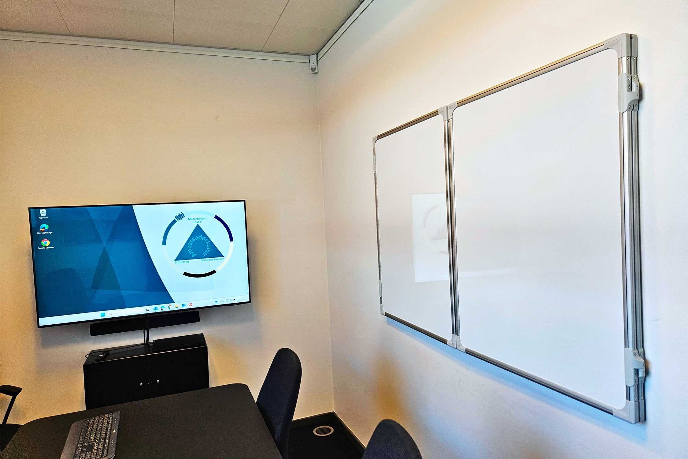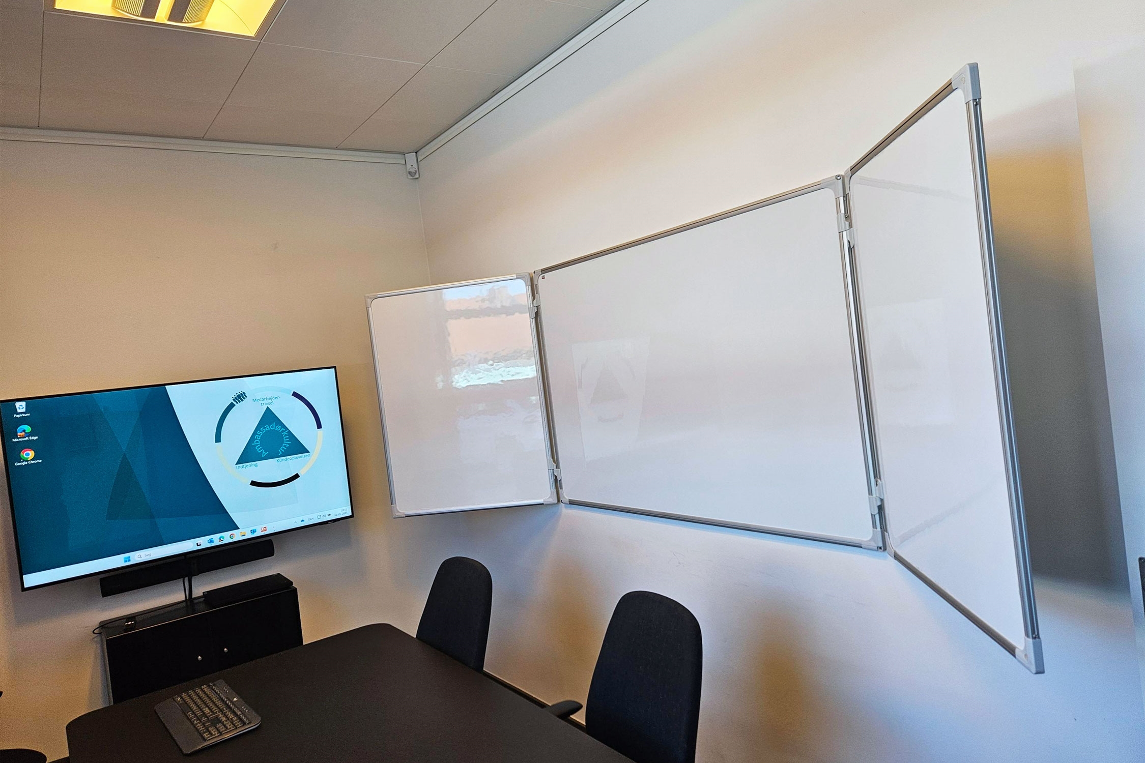 Whiteboard tavle til vegg med 2 dører, som gir 3 ganger så mye skriveplass som en vanlig whiteboardtavle.