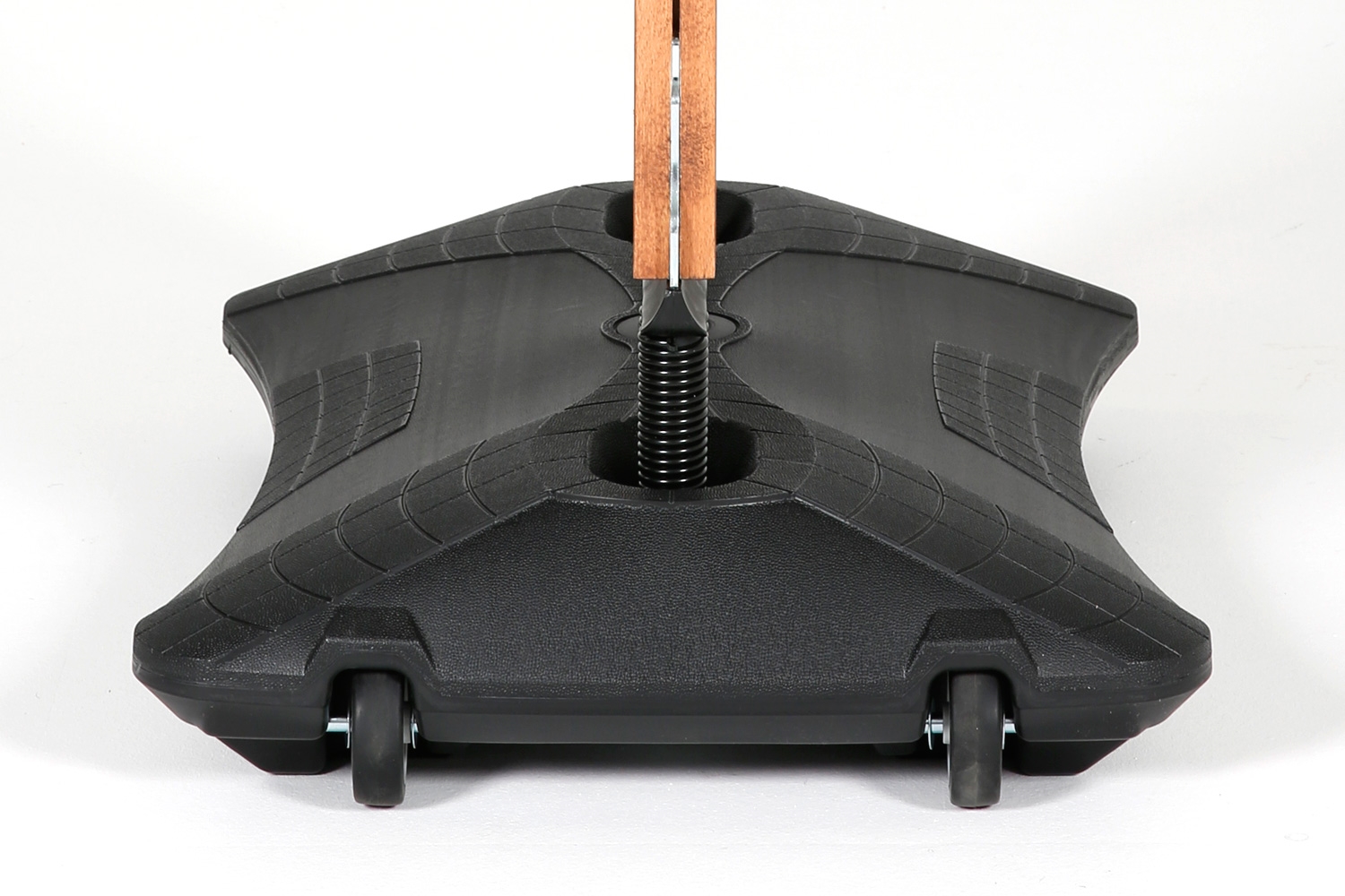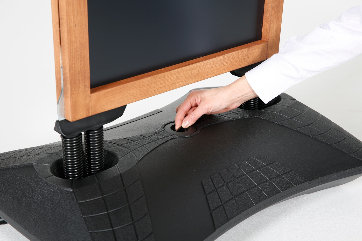 Foten kan fylles med vann eller sand, og da skal det virkelig store krefter til for å rokke ved skiltet. Husk å blande frostvæske i vannet om vinteren. Skiltet og foten er forbundet med to fjærer som gjør at det kan bevege seg med vinden i stedet for å velte – noe alminnelige skilt kan gjøre.