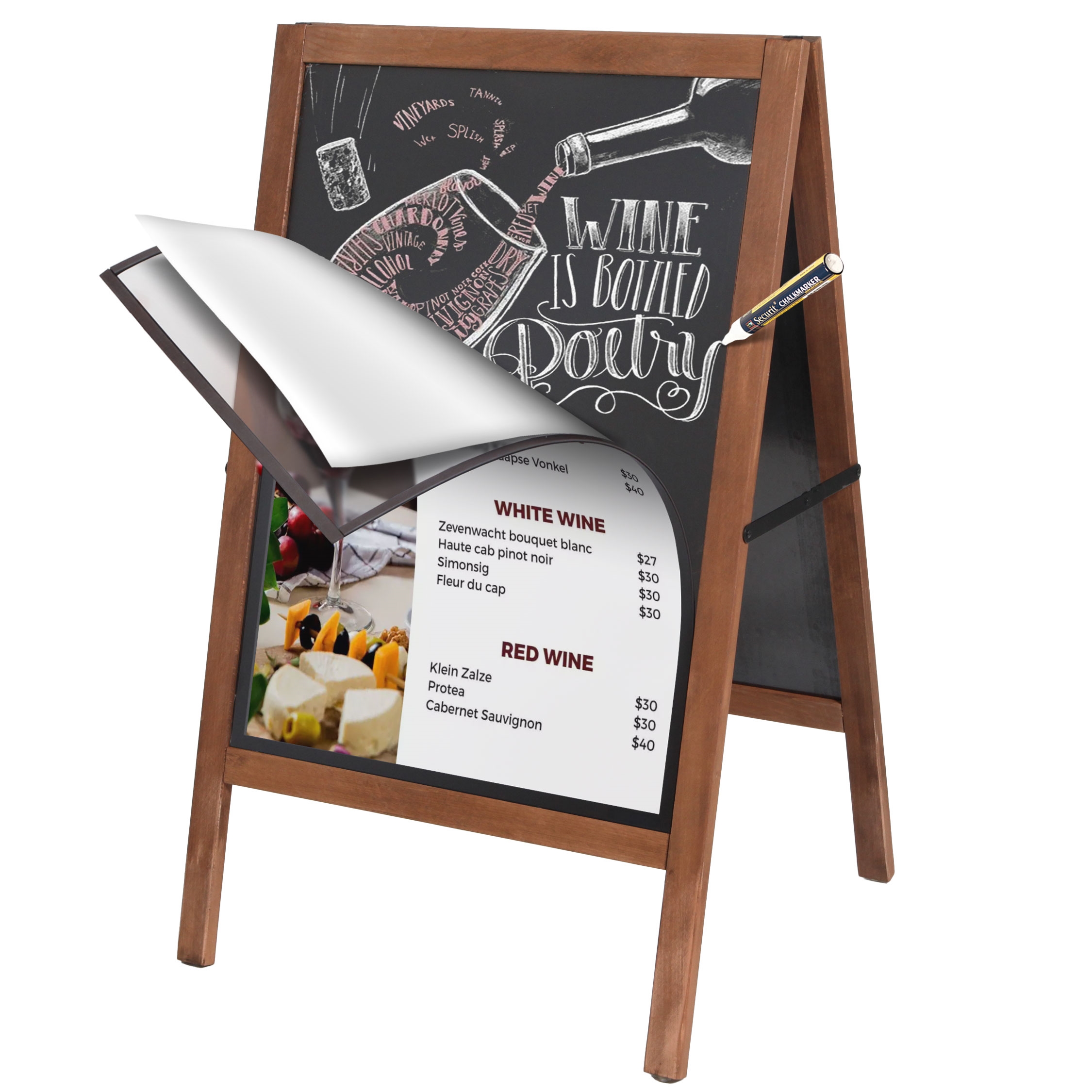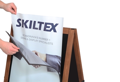 Denne fantastiske, allsidige bukken kan brukes både som en tradisjonell gatebukk med plakater eller som et krittavleskilt som kan skrives på med kritt eller krittusjer.