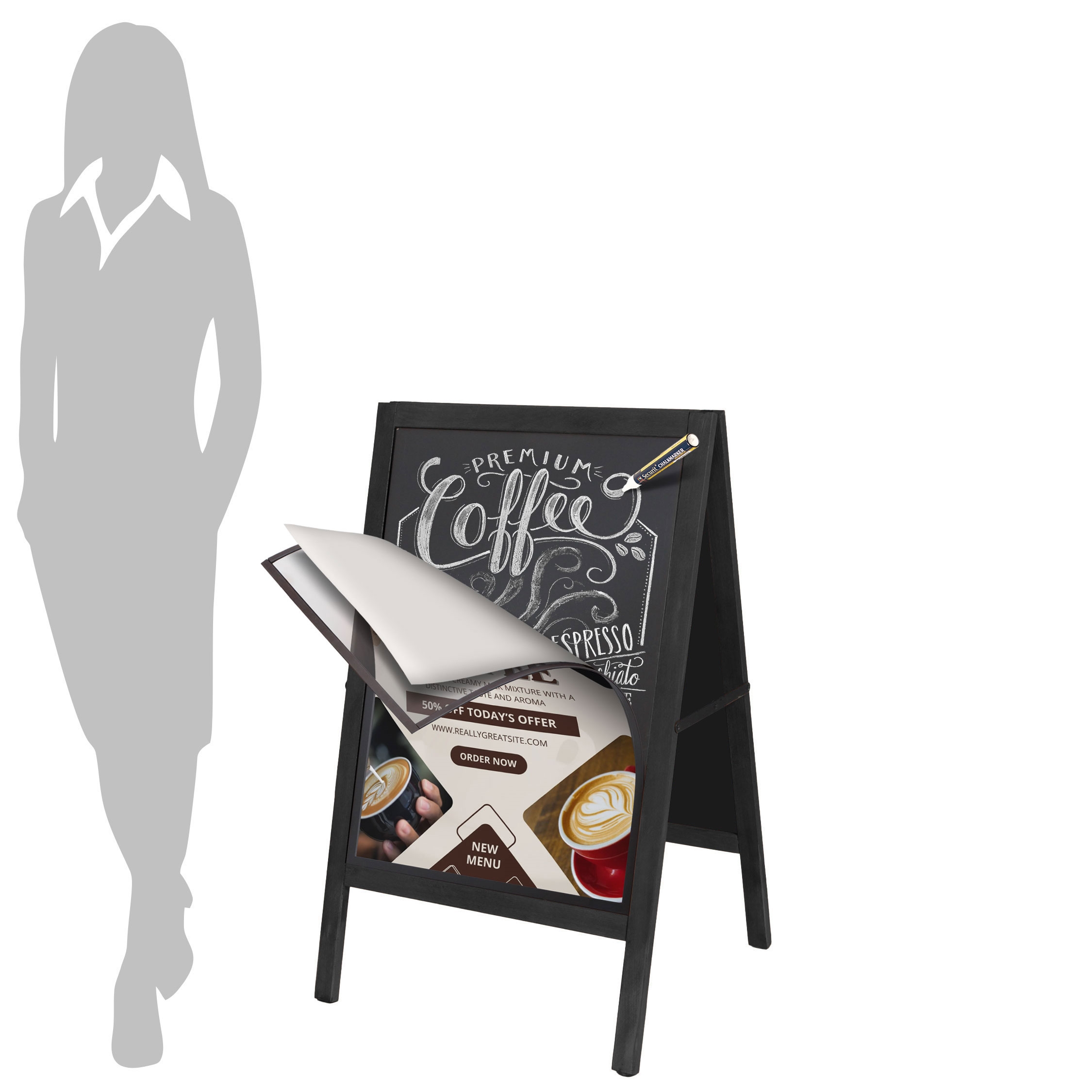 Denne fantastiske, allsidige gatebukken kan brukes både som en tradisjonell gatebukk med 50x70 cm plakater eller som et krittavleskilt som kan skrives på med kritt eller krittusjer.